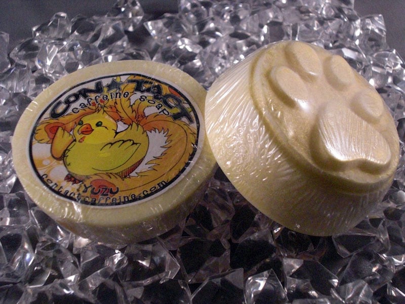 Caffeine Soap Ingredients: Coconut oil, Palm oil, Safflower oil, Glycerin (kosher, of vegetable origin), Shea butter (refined naturally crushed), Purified water, Sodium hydroxide, Caffeine, Sorbitol, Sorbitan oleate, Soy bean protein, Titanium Dioxide, Fragrance oils, Body safe colorants.