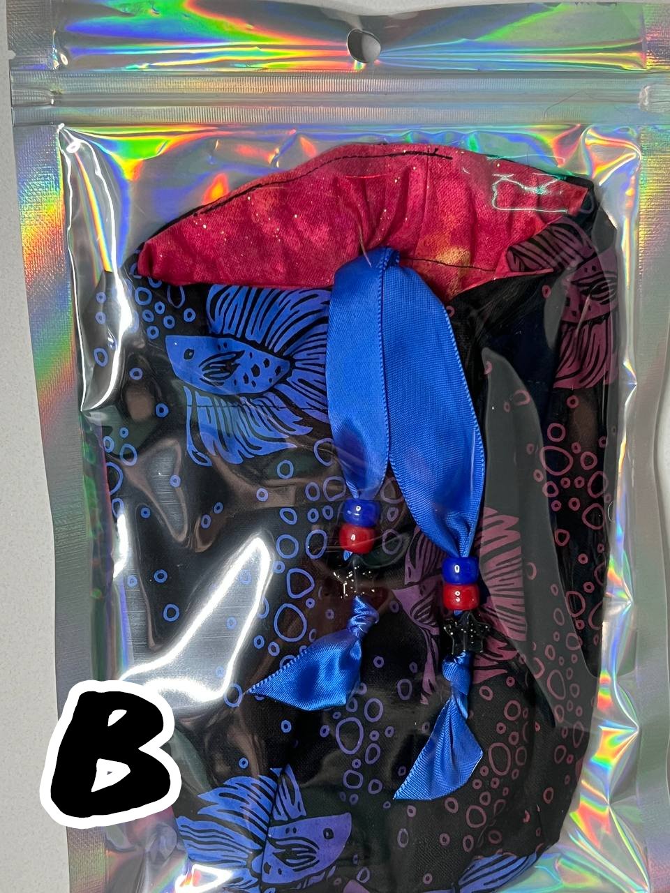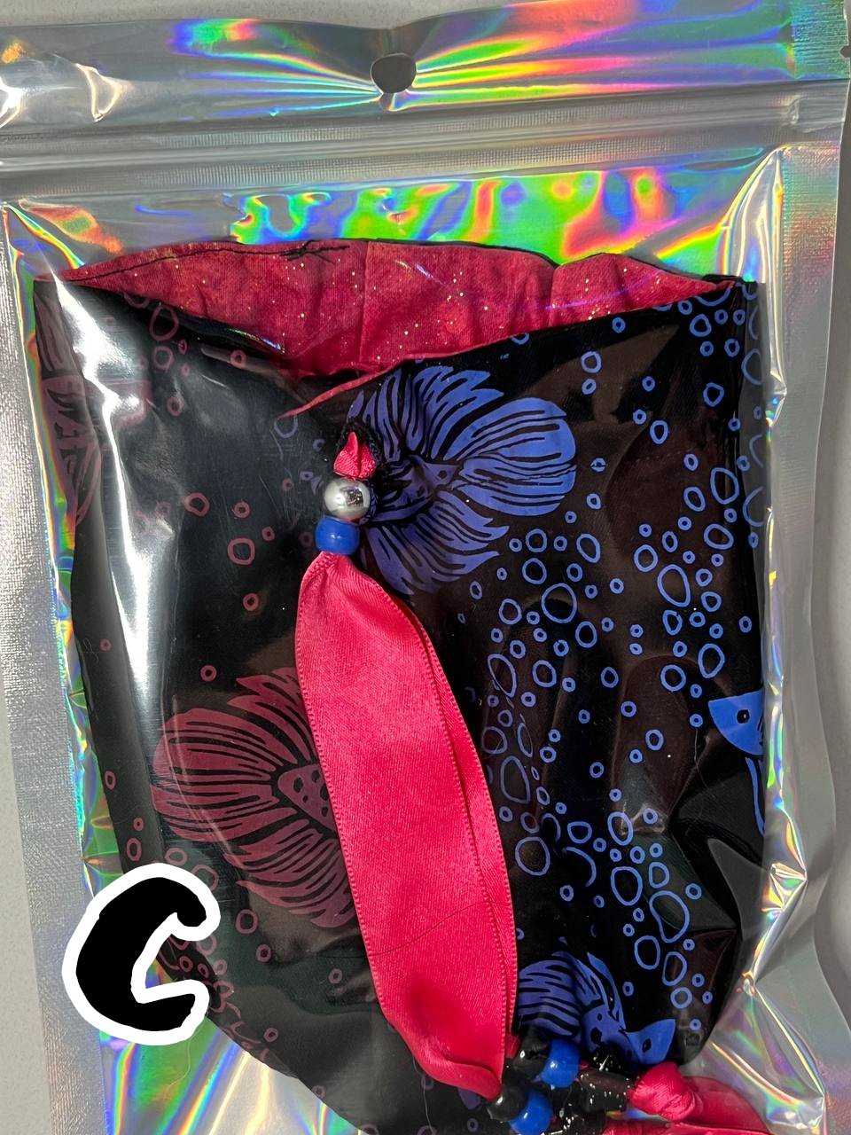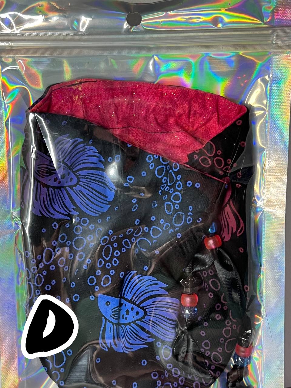 A handmade dice bag for all your dice hoarding needs! Featuring a round bottom, with a ribbon drawstring and a bead slider to hold it closed. Fits around a hundred (100!!!) standard-ish sized polyhedral dice.